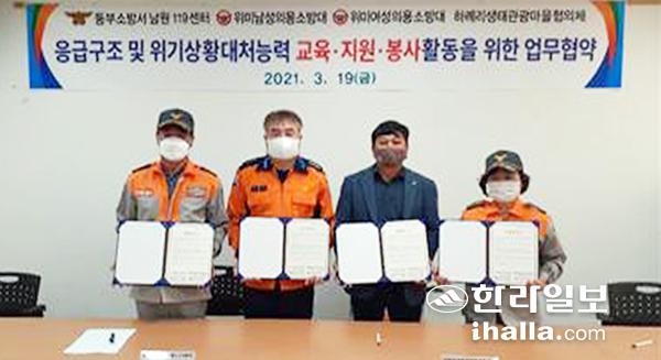 제주동부소방서 남원119센터(센터장 김종빈)는 지난 19일 위미비상대기소에서 주민들의 응급처치 능력 향상을 위해 하례리 생태관광마을협의체(위원장 허지성)와 양해각서(MOU)를 체결했다.
