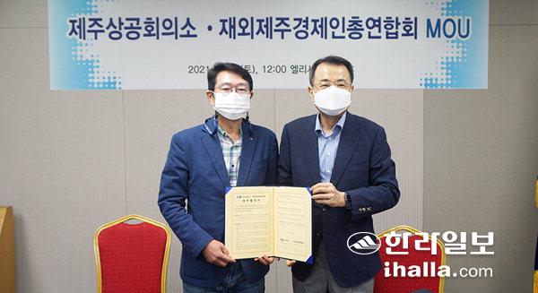 제주상공회의소(회장 양문석)는 지난 26일 엘리시안제주CC에서 제주 출신 기업가들의 단체인 재외제주경제인총연합회와 업무협약을 체결했다.