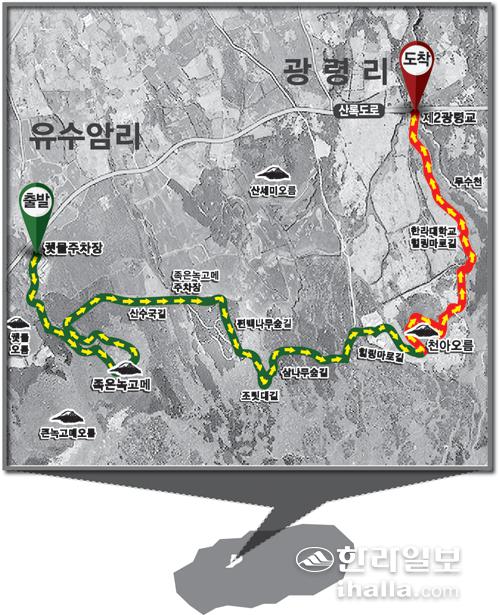 지난달 25일 진행된 한라일보의 '2021년 제2차 제주섬 글로벌 에코투어'는 제주시 애월읍 유수암리 궷물오름 주차장에서 시작해 족은노꼬메 둘레길, 삼나무 숲길, 조릿대길, 천아오름, 광령천을 지나 산록도로로 이어지는 코스로 진행됐다.