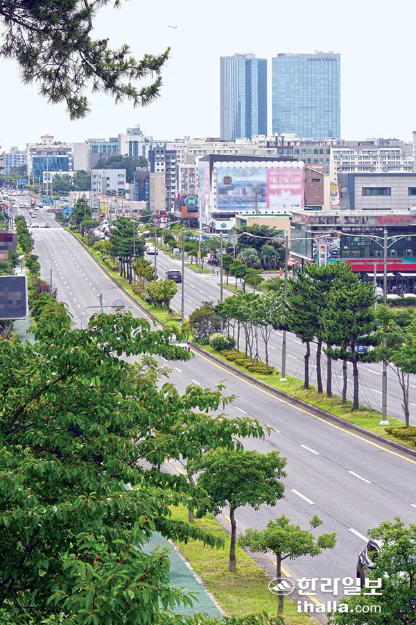 제주시 동서를 연결하는 연북로. 이곳은 지난 2008년 제주에서 처음 조성되기 시작한 도시숲으로 소나무를 비롯해 키 큰 교목과 키 작은 관목들이 어우러져 도로와 도심을 연결하는 녹색띠를 형성하고 있다. 사진=이상국기자