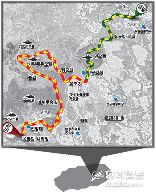 지난 8일 한라일보의 '2021년 제7차 제주섬 글로벌 에코투어'가 진행됐다. 코스는 제주시와 남원을 잇는 남조로에 위치한 수망리 숲길을 지나 의귀마로길, 민오름, 목장길, 서중천, 거린족은오름, 머체왓숲, 전망대를 지나 목장길 시작점으로 돌아왔다. 이번 투어 역시 코로나19 확산세를 감안, 비대면으로 최소한의 인원만 참석한 채 진행됐다.