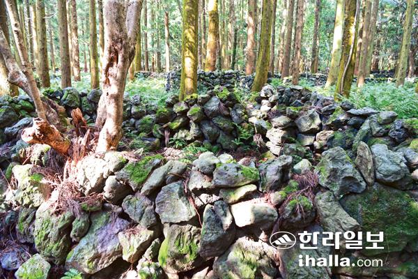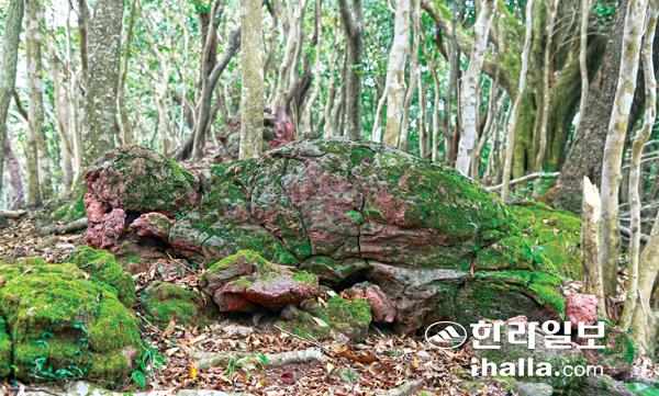 서중천을 건너 한참을 걸어 거린족은오름을 올랐다. 거린족은오름 정상에 거북바위가 있는데, 돌의 형상이 거북이의 모습과 비슷해 붙여진 이름이다. 정말 거북이 같은 형상이어서 신기했다. 박태석 씨는 "한라산 화산이 분출했을 때 용암 덩어리가 날아와 생긴 것"이라고 설명했다.