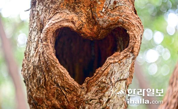 나무에 생긴 하트 모양의 구멍이 눈길을 끈다