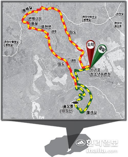 지난달 29일 '2021 제주섬 글로벌 에코투어'가 열 번째 발걸음을 내디뎠다. 이날 에코투어는 서귀포학생문화원(청소년수련원)야영수련장~영천~솔오름~임도~영천변~편백나무숲길~한라산둘레길(동백길)~임도~서귀포학생문화원야영수련장에 이르는 여정이었다.