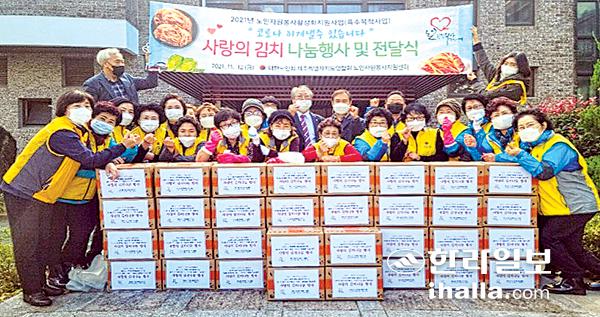 대한노인회 제주특별자치도연합회(회장 강인종)는 지난 12일 홀로 사시는 어르신 100여명에게 김치를 전달했다. 사랑의 김치 만들기는 대한노인회 제주연합회 노인자원봉사지원센터 소속 '한올간병봉사단(코치 변명효)' 회원 20여명이 참여해 배추 300포기로 김치를 만들었다.