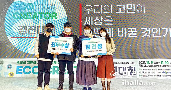 호남·제주권 LINC+사업단 협의회 10개교가 참가해 지난 10일 국립아시아문화전당에서 개최된 'ACC 소셜디자인 랩 에코 크리에이터 경진대회'에서 제주대 메카트로닉스공학전공 '경메 팀'이 '전기차 폐배터리를 활용한 전력통합 관리시스템 개발'을 주제로 최우수상을 받았다.
