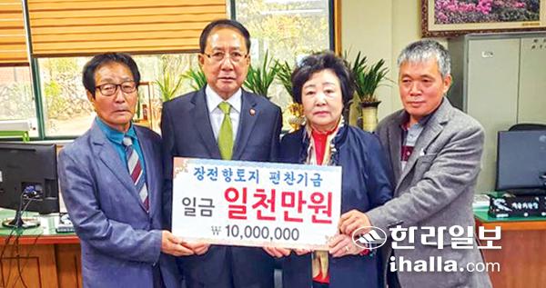 제주시 애월읍 장전리 출신 양봉해, 강창아씨 부부는 지난 11일 애월읍 장전리 향토지 편찬위원회 사무실을 찾아 향토지 편찬을 위해 써 달라며 성금 1000만원을 기부했다.
