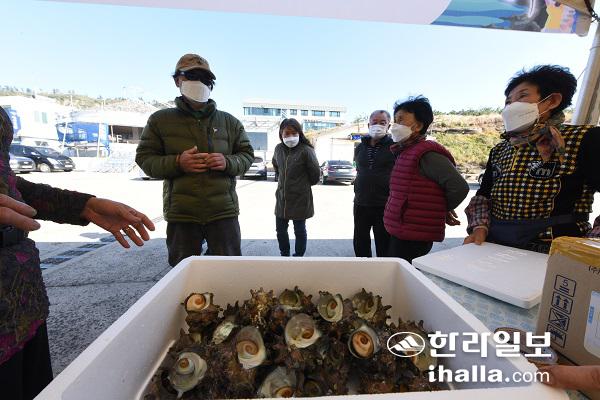 19일 개막한 '제10회 수월봉 트레일' 행사장에서 고산리 어촌계 해녀들이 뿔소라를 판매하고 있다. 이상국기자