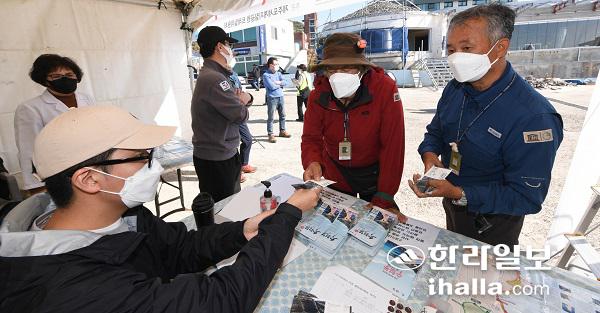 19일 수월봉 트레일 행사 중 운영되는 코스 중 1곳을 완주한 후 5000원 상당의 수월해전을 지급하고 있는 모습. 이상국기자