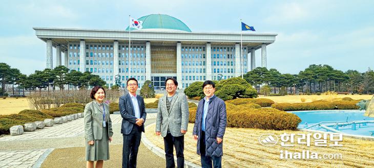 지난달 28일 국회 본관 앞에서 국회 제주출신 공직자 모임의 멤버인 현은희 실장, 현승철 실장, 고광철 보좌관, 서재만 입법조사관이 인터뷰가 끝나고 기념촬영을 위해 포즈를 취하고 있다.