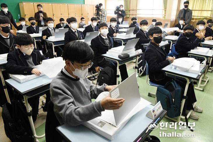 김광수 교육감의 '중학생 스마트 기기 지원' 공약에 따라 6일 오전 제주중앙중 1학년 신입생들에게 노트북을 전달하고 있다. 강희만기자