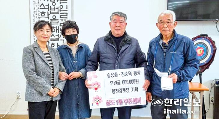 제주시 삼도1동 3통장 송용출씨, 5통장 김순덕씨는 지난 7일 용천경로당을 방문해 어르신들과 대화의 시간을 갖고 경로당 운영에 도움이 되길 바란다며 60만원을 기탁했다.