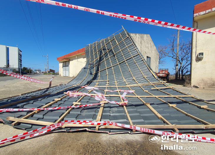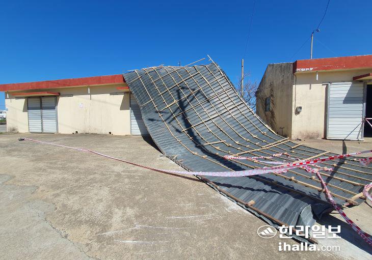 지난 12일 강풍의 영향으로 날아간 제주시 한경면 두모리 창고 지붕. 이상국기자