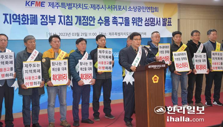 제주특별자치도·제주시·서귀포시 소상공인연합회가 21일 제주도의회 도민카페에서 기자회견을 열고 정부의 지역화폐 권고안을 수용해 농협 하나로마트의 제주 지역화폐 탐나는전 가맹점 등록을 취소하라고 요구하고 있다. 이상국기자