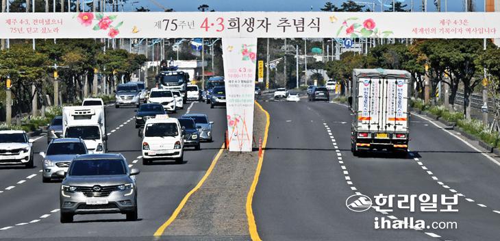 제75주년 4·3 희생자 추념식을 일주일 앞둔 27일 제주시 번영로에 4·3 추념식 안내 입간판이 설치돼 추모 분위기를 고조시키고 있다. 이상국기자