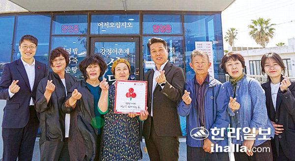 서귀포시 대천동 소재 강정어촌계식당(대표 이성애)은 최근 매장 앞에서 대천동지역사회보장협의체(공동위원장 김복신·정창용)와 제주사회복지공동모금회(회장 강지언)가 함께하는 '착한가게 캠페인'에 동참하고 현판 전달식을 가졌다.