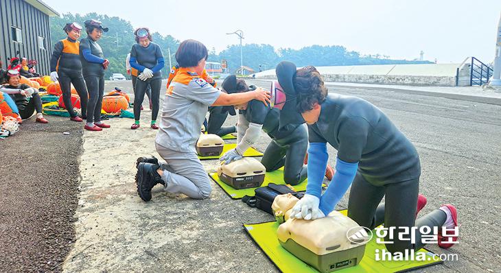 제주특별자치도 서귀포소방서(서장 박광찬)와 중문여성의소대(대장 강봉희)는 15일 하예어촌계에서 해녀 30여명을 대상으로 심폐소생술 및 응급처치 방법 교육을 실시했다. 교육은 최근 도내 해녀 고령화로 물질 작업 중 심정지 환자 발생함에 따라 긴급상황 발생 시 대응능력 제고를 위해 이뤄졌다.