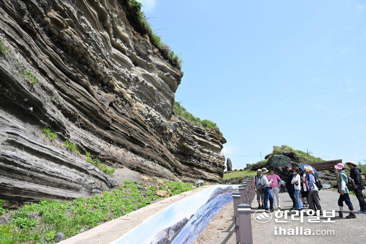 수월봉 지질트레일을 찾은 탐방객들이 해설사의 설명을 들으며 지질층을 탐방하고 있다. 이상국기자