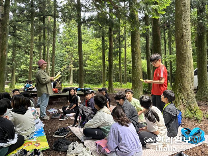 하귀초 어린이들이 사려니 숲길 체험 후 각자의 소감을 발표하고 있다. 송문혁기자