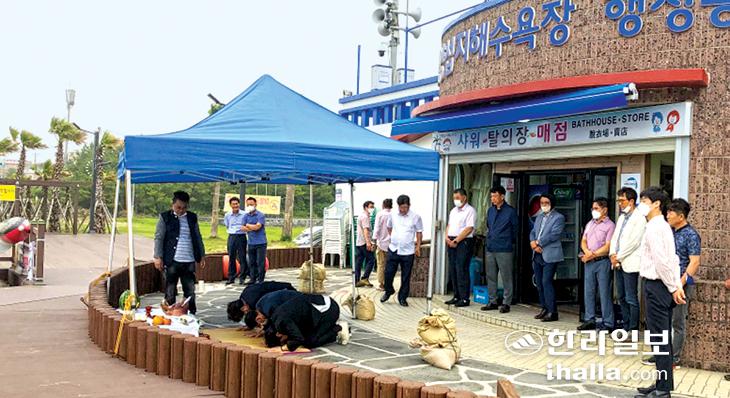 서귀포시 성산읍 신양리(이장 정광숙)는 지난 1일 신양섭지해수욕장에서 성산읍장, 이장협의회, 마을주민 등 50여명이 참석한 가운데 해수욕장 개장에 따른 무사안녕 기원 행사를 가졌다.