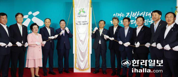 추경호 경제부총리겸 기획재정부 장관(왼쪽 네번째 부터), 우동기 지방시대위원장, 이정현 지방시대위원회 부위원장, 이주호 사회부총리 겸 교육부 장관, 이철우 경북도지사, 원희룡 국토교통부 장관 등 참석자들이 10일 오후 세종시 KT&G 세종타워에이 빌딩에서 대통령 직속 지방시대위원회 출범 현판식을 하고 있다. 국가균형발전위원회와 지방자치분권위원회가 통합한 지방시대위원회는 향후 5년간 지방시대 국정과제와 지역공약을 총괄하는 콘트롤타워로서, 지방시대 종합계획을 수립하고 각종 균형발전 시책 및 지방분권 과제를 추진하게 된다. 연합뉴스