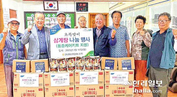 김녕농협(조합장 오충규)은 지난 10일 초복을 맞아 고령 조합원과 농업인의 건강을 기원하기 위해 관내 11곳의 경로당 회원들에게 삼계탕 나눔 행사를 진행했다.