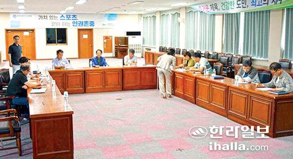 제주특별자치도체육회(회장 송승천)는 지난 10일 도체육회 세미나실에서 고위직을 대상으로 4대 폭력(성희롱·성폭력·성매매·가정폭력) 예방교육을 실시했다. 앞서 지난 4~5일까지 양일간에 걸쳐 사무처 임직원과 지도자 및 선수들을 대상으로 직장 내 성폭력 등 폭력행위가 발생하지 않도록 4대 폭력 예방교육도 실시했다.