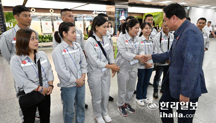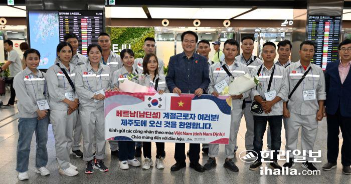 제주 농촌지역의 인력난을 덜어주기 위한 베트남 남딘성 계절근로자 14명이 13일 제주에 왔다. 강희만 기자