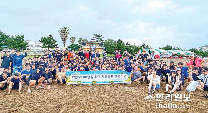 서귀포중학교(교장 송계화)는 지난 11일 2학년 학생 146명을 대상으로 화순해수욕장에서 '학업 중단 예방을 위한 사제동행 생존수영 프로그램'을 실시했다. 송계화 교장은 "학생들이 학교 생활에 즐거움을 느끼며 학업 중단 예방에도 도움이 되었을 것으로 기대한다"고 했다.