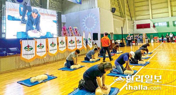 이번 교육은 심정지 환자 발견 시 최초 목격자의 심폐소생술 시행률을 높이기 위한 응급처치교육으로, 서귀포시지역 농촌지도자 400여명이 모인 가운데 심폐소생술 이론 교육, 흉부압박 실습 등으로 진행됐다.