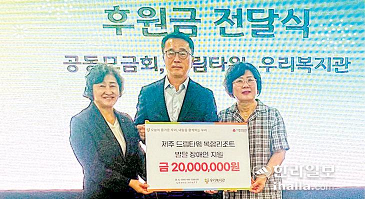 제주 드림타워 복합리조트는 지난 1일 제주시 아라동에 개관한 우리복지관에 도내 발달장애인의 복지 향상과 자립 지원을 위한 후원금 2000만원을 전달했다.