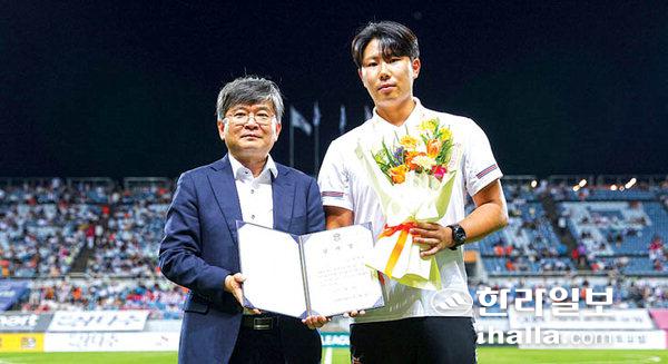 제주유나이티드 구창용 대표이사는 지난 3일 제주월드컵경기장에서 열린 전북 현대와의 홈 경기 하프타임에 바다에 빠진 여성을 구한 제주유나이티드 U-15 유소년팀인 제주중학교 이건우 코치에게 감사장을 전달했다.