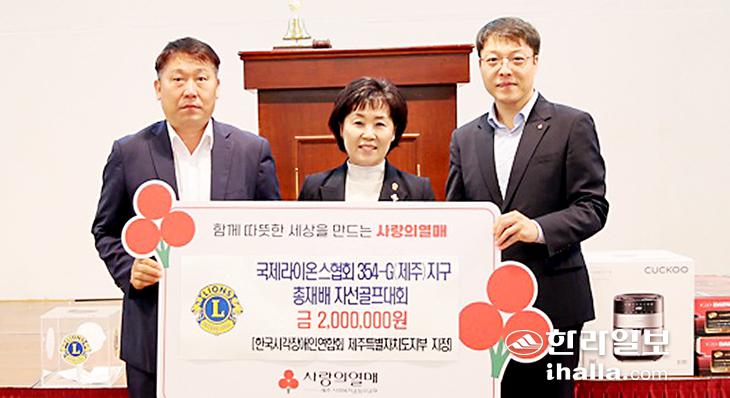 국제라이온스협회 354-G(제주)지구(총재 박용선)는 지난 6일 타미우스CC에서 총재배 자선골프대회를 개최하고 이웃사랑 성금 200만원을 제주사회복지공동모금회(회장 강지언)에 기탁했다. 이번 성금은 도내 시각장애인 복지증진 사업으로 사용될 예정이다.