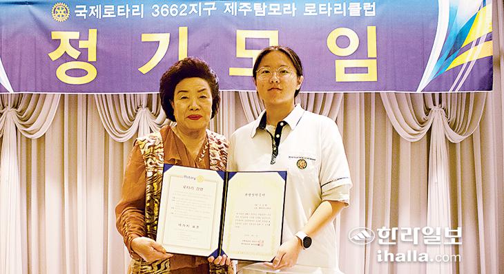 국제로타리 3662지구 제주탐모라 로타리클럽(회장 김민조)은 지난 7일 아스타호텔 연회장에서 개최된 정기모임 자리에서 오정희 장학인이 제주여자고등학교 김남희 학생에게 장학금 100만원과 증서를 전달했다고 밝혔다.