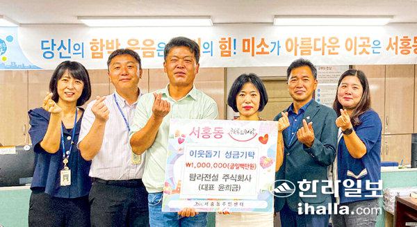 탐라전설(주)(대표 윤희금)는 지난 7일 서귀포시 서홍동주민센터(동장 김영철)를 방문해 추석을 앞둔 취약계층을 위해 사용해 달라며 100만원의 성금을 기탁했다.
