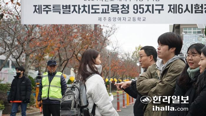 대학수학능력시험 95(제주)지구 시험장 중 한 곳인 중앙여자고등학교 정문에서 수험장으로 들어서는 수험생과 교사가 인사를 나누고 있다. 강다혜 기자