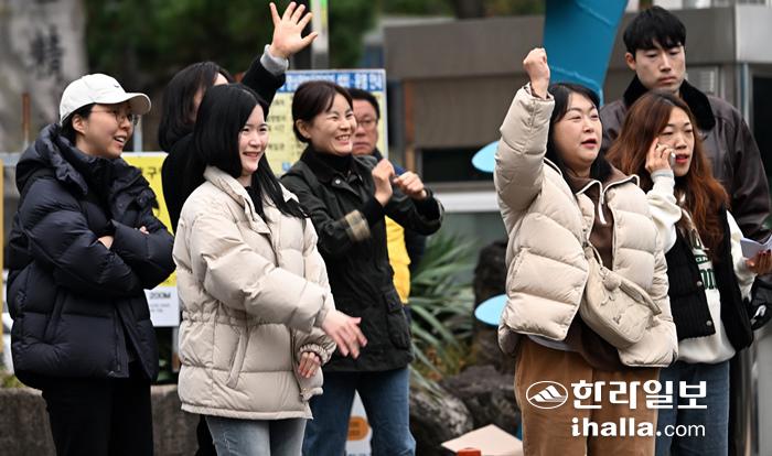 16일 2024학년도 대학입학수학능력 시험을 앞두고 선생님들과 학부모들이 제주제일고 시험장에 입실하는 수험생들을 응원하고 있다. 강희만 기자