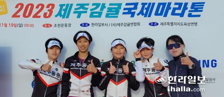 19일 열린 2023 제주감귤국제마라톤에서 10㎞ 코스에 도전한 제주동중 사이클팀.