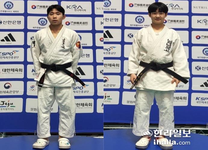2023 제주컵 국제유도대회 첫날 남고부와 여고부에서 금메달을 획득한 양민준과 강여원.