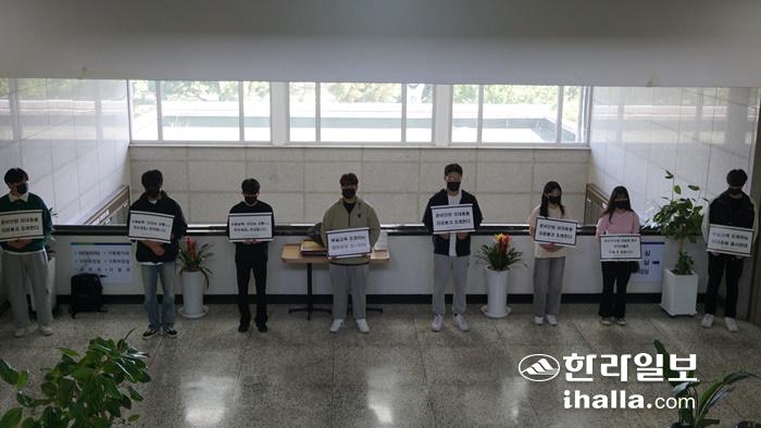제주대학교가 의대 정원을 100명으로 늘린다는 내용을 담은 학칙 개정을 재심의하기 위해 23일 본관 회의실에서 교수평의회를 진행 중인 가운데, 의대 학생들이 반대하는 손팻말을 들고 본관에서 피켓 시위를 진행하고 있다. 강다혜기자