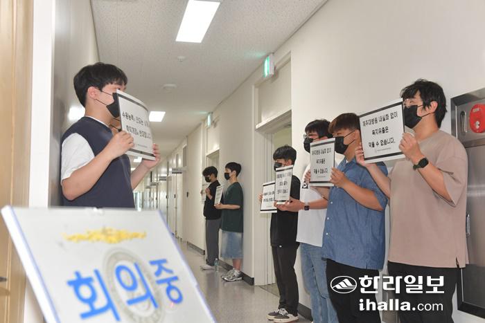 제주대 의대생들은 지난 23일과 마찬가지로 이날 평의회 회의장 앞에서 검은색 마스크를 쓰고 피켓시위를 벌였다. 학생들은 '의료계 목소리가 배제된 의대 증원 절차는 민주적이지 않습니다', '준비 안 된 의대 증원 의료 붕괴 초래한다', '수용 능력이 안 되는 상황에서의 학칙 개정을 반대합니다' 등의 피켓을 들었다.