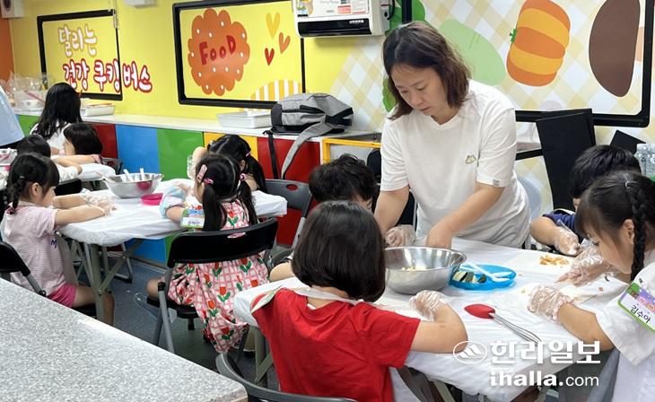 15일 '달리는 건강 쿠킹버스'에 오른 아이들이 요리 체험을 하고 있다. 서귀포시 제공