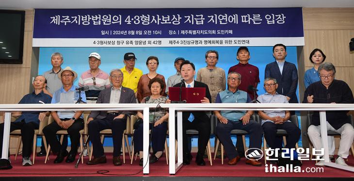 제주4·3진상규명과 명예회복을 위한 도민연대와 4·3형사보상 청구 유족 43명은 8일 제주도의회 도민카페에서 기자회견을 열고 4·3형사보상금의 조속 지급을 촉구했다. 이상국기자