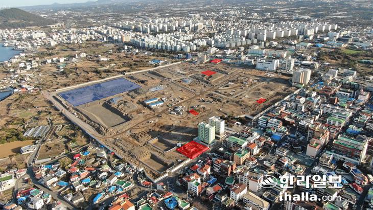 화북상업지역 항공 사진. 빨간색으로 표시된 부분이 매각을 추진하는 체비지. 제주시 제공