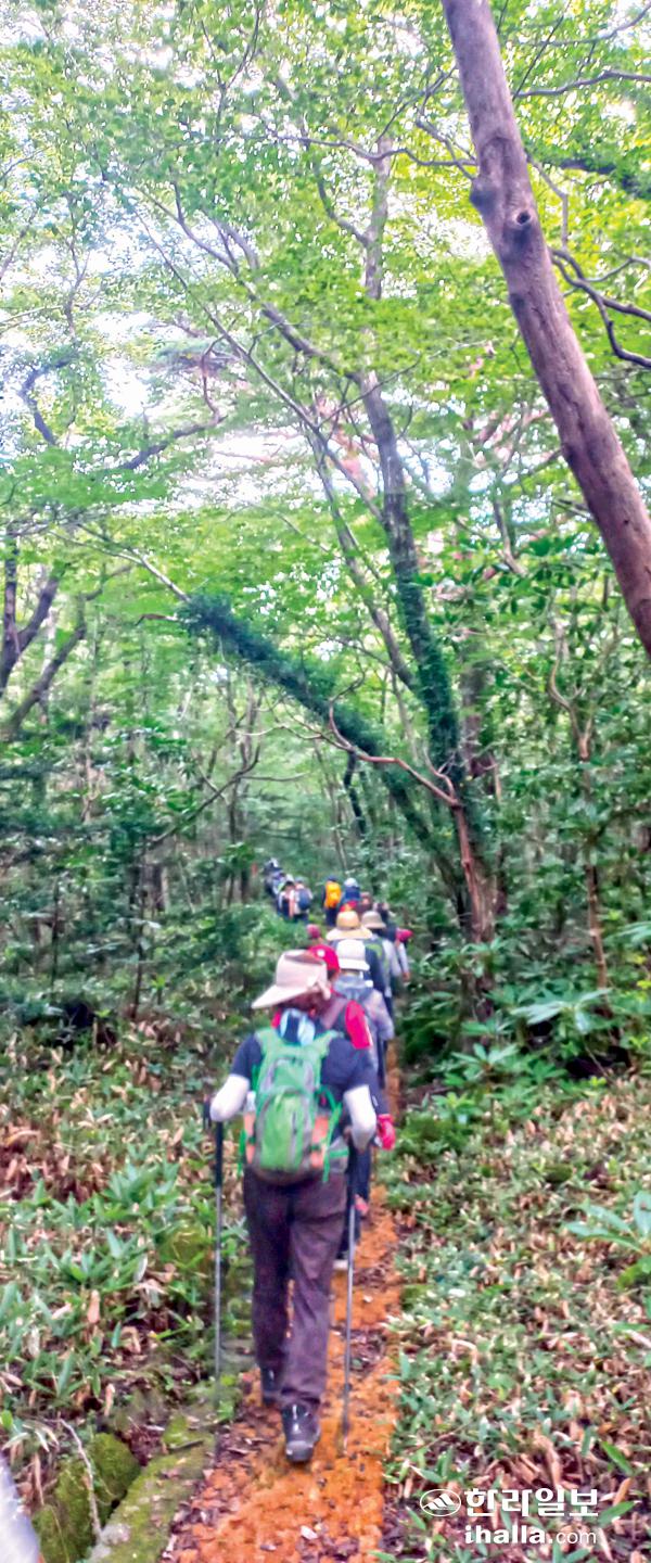 법정사 주차장에서 트레킹의 첫발을 내딛으며 숲으로 들어섰다. 산죽(조릿대) 사이로 콘크리트로 구축된 하원수로가 끝없이 이어졌다. 그 길을 걷는다. 수로에 빠지지 않으려고 그네를 타는 곡예사처럼 비틀비틀 걸었다. 1950년대 후반 한국전쟁을 겪은 후 빈곤에 허덕이던 시절, 벼농사를 짓기 위해 영실과 언물을 하원 저수지로 보내려고 수로길을 만들었던 것이다.