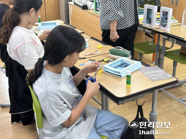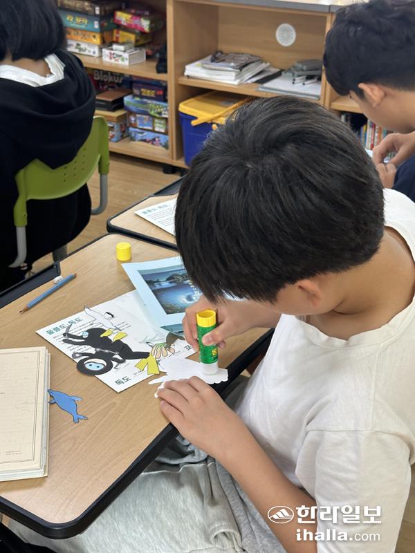 마지막 시간은 '팝업북 만들기' 체험이 진행됐다. 아이들은 준비된 팝업북에 각자의 개성대로 가위와 풀을 활용해 열심히 꾸미기 시작했다. 해녀, 해초, 돌고래, 갈매기 등을 팝업북에 붙여보며 상상 속의 독도 바다와 제주 해녀의 모습을 구현했다. 아이들이 입체로 된 팝업북을 통해 마치 독도 해녀분들의 이야기를 직접 펼쳐 들어보는 것 같았다.