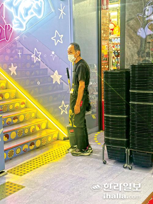 오사카 돈키호테 도톤보리점에 일하고 있는 노인의 모습. 송문혁 기자