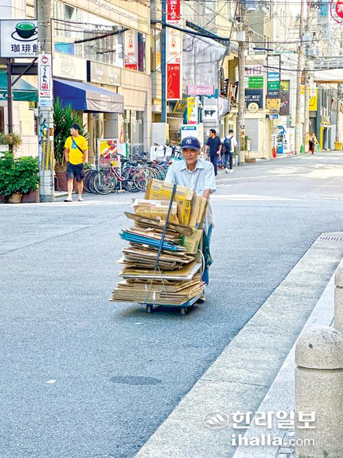오사카 난바역 근처 길에서 폐지를 줍고 다니는 노인의 모습. 송문혁 기자