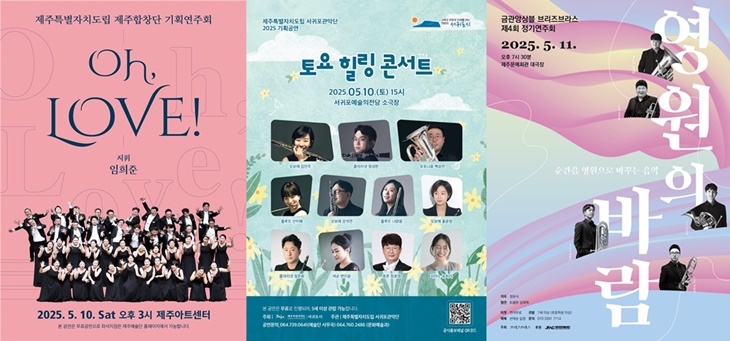 [한라일보] 5월 가정의 달을 맞아 이번 주말 제주도내 곳곳에 아름다운 선율이 울려퍼진다. 제주도립 제주합창단과 서귀포관악단, 금관앙상블 브리즈브라스의 공연이 잇따른다.