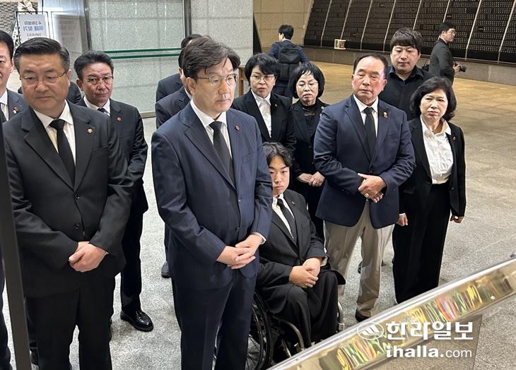권성동 공동선대위원장이 17일 제주4·3평화공원을 찾아 위패봉안실을 둘러보고 있다.